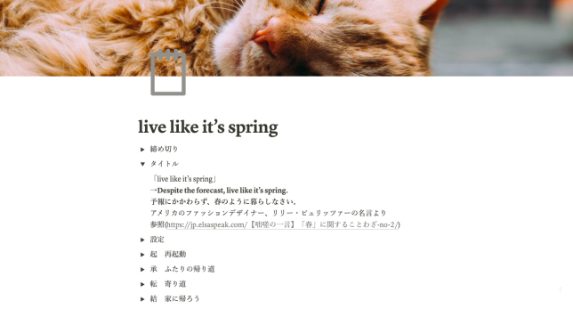 こんな風に、▷のマーク(トグル)を開くと、その項目の文章が出てくる形式で書いています。内容は、締め切り日・タイトル・設定・起承転結ごとのストーリーといたって普通のもの。
